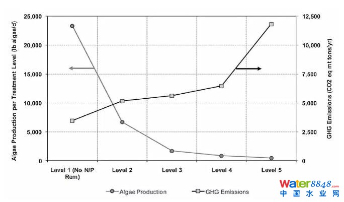 由于污水營養(yǎng)物去除旨在改善水體,減少受納水體藻類生產(chǎn)過程中的富營養(yǎng)化,因此我們使用一個(gè)替代參數(shù)——“潛在藻類產(chǎn)量”來評(píng)估水質(zhì)改善狀況。每生成100磅藻類需要7.2磅的N和1.0磅的P。依據(jù)此關(guān)系,將藻類產(chǎn)量的減少表示為N或P減少的函數(shù)。結(jié)果表明,處理等級(jí)從1級(jí)變化到3級(jí),潛在藻類產(chǎn)量減少了將近95%;從3級(jí)變化到5級(jí)時(shí),又減少了4%,而這部分增量的改進(jìn)卻幾乎使溫室氣體排放量翻了一番。