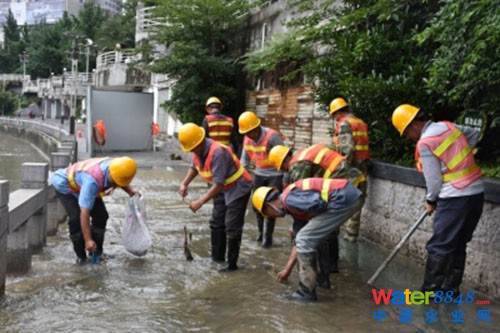 記者來(lái)到青云路帆影廣場(chǎng)下側(cè)的南明河岸邊,只見(jiàn)20余名工作人員正冒雨清掏貴棉大溝排污口處的垃圾。