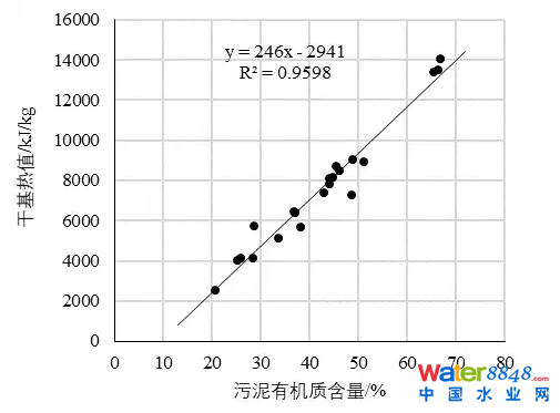 圖2 污泥有機質(zhì)含量與熱值的關(guān)系