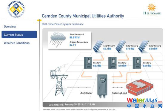 2012年7月,CCMUA太陽能中心啟用了一個1.8兆瓦的太陽能光伏發(fā)電系統(tǒng),該系統(tǒng)由7200多塊太陽能電池板組成,覆蓋7英畝大小的開放池。設(shè)計的創(chuàng)新之處在于8-9英尺高的天篷系統(tǒng)的安裝,不會干擾其他設(shè)備池的使用,操作或維護。太陽能光伏結(jié)構(gòu)是防腐(鹽水、碳酸和硫化氫)設(shè)計,由Schletter(一家知名的光電托架系統(tǒng)供應(yīng)商,包括車棚)制造的改裝車棚天篷。根據(jù)PPA,CCMUA無資本支出,也不負責(zé)任何運營和維護成本。 CCMUA唯一的財務(wù)責(zé)任是每月支付固定價格且為期15年的太陽能電費。 CCMUA估計將節(jié)省數(shù)百萬美元的能源成本。據(jù)估計,太陽能光伏系統(tǒng)每年將產(chǎn)生大約220萬千瓦時(度)的電力,并且基于CCMUA互動網(wǎng)站的預(yù)測表現(xiàn)會更好。該網(wǎng)站顯示當(dāng)前和累積的能源產(chǎn)量以及環(huán)境屬性,并實時反映當(dāng)前的能源生產(chǎn)情況,如下圖所示。