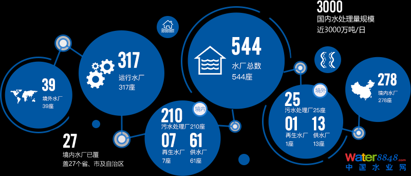 北控水務(wù)先后以PPP、BOT、TOT、委托運(yùn)營(yíng)、股權(quán)收購(gòu)、合資合作等模式,積極拓展城鎮(zhèn)水務(wù)市場(chǎng)。對(duì)水源項(xiàng)目、輸水項(xiàng)目、供水項(xiàng)目、污水項(xiàng)目、再生水項(xiàng)目、管網(wǎng)運(yùn)營(yíng)等提供投資、建設(shè)和運(yùn)營(yíng)管理的綜合解決方案。截至2017 年6月30日,北控水務(wù)國(guó)內(nèi)水處理規(guī)劃規(guī)模近3000 萬(wàn)噸/ 日,水廠總數(shù)超過(guò)540座,境內(nèi)水廠已覆蓋27個(gè)省、市及自治區(qū)。