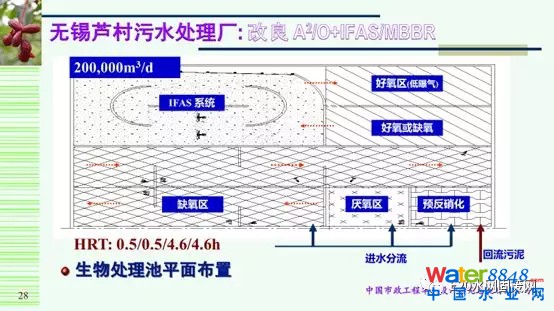 無錫蘆村污水處理廠是華北市政總院設(shè)計的我國首座采用一級A標準的污水廠。鄭興燦介紹,作為首座采用一級A標準的改造工程,蘆村污水處理廠采用了改良的A2/O+IFAS/MBBR。該廠最早使用的活性污泥法,后改造成A2/O,目前使用了改良A2/O+國內(nèi)首個大型IFAS/MBBR系統(tǒng),并設(shè)置了初沉發(fā)酵池。該廠不僅實現(xiàn)了冬季氨氮的達標,同時,在碳源的投加下實現(xiàn)了總氮的達標。至今,該工程已穩(wěn)定運行10年,非常成功。