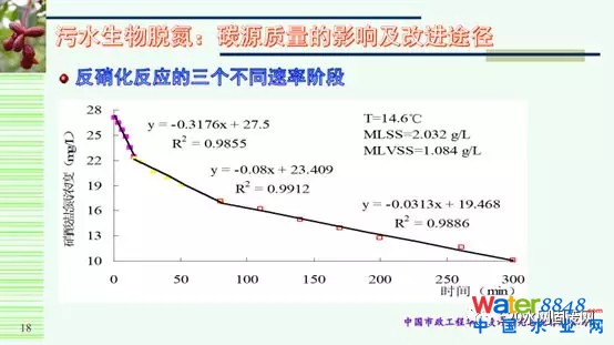 下圖為實際測定的反硝化反應(yīng)的三個不同速率階段,初始10分鐘左右去除6mg/L的硝酸鹽,之后60多分鐘再去除6mg/L,然后是緩慢的反硝化,約4個小時再去除6mg/L,可以看出,在很多工藝系統(tǒng)中,大部分時間反硝化速率處于很低的階段,有些設(shè)計人員認為可以通過無限增加泥齡的方式來解決總氮去除率提升的問題,但實際上,缺氧端每增加1小時的停留時間,總氮的去除僅能增加1mg/L左右,考慮到硝化菌和反硝化菌之間的均衡,真正需要的時間可能是2小時。兩個小時的停留時間才增加1mg/L,從投資和運行成本來講,還不如適當?shù)耐都油獠刻荚,因為每去?mg/L左右的總氮,碳源費用大概是0.1元。