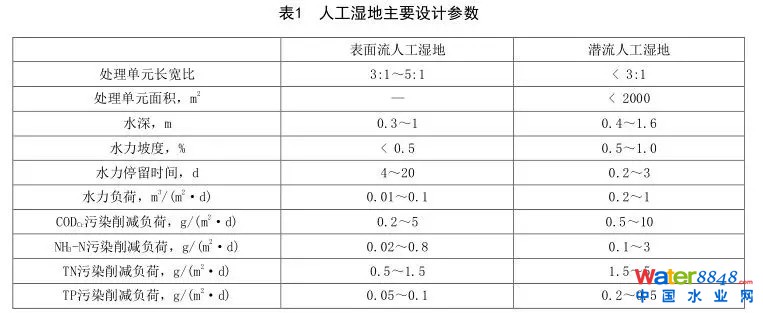 4.4.1.1人工濕地主要設(shè)計(jì)參數(shù)宜根據(jù)試驗(yàn)資料確定,無試驗(yàn)資料時(shí),可參考表1確定。