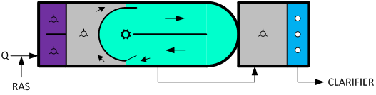 如前所述,卡魯塞爾氧化溝最明顯的特征是以立式低速表曝機取代水平軸表曝機,這樣做的工藝背景是使曝氣區(qū)基本接近完全混合反應(yīng)器的流態(tài),曝氣區(qū)下游的長渠道則基本接近推流反應(yīng)器模型的流態(tài)。因此卡魯塞爾氧化溝實際上是將兩種反應(yīng)器模型的優(yōu)勢結(jié)合在一起,既可利用長溝道進行較為徹底的生化反應(yīng),還能借助完全混合區(qū)的攪拌、緩沖能力化解水質(zhì)負荷的變化,具有較強的抗沖擊負荷能力。從現(xiàn)在的工藝觀點來看,這樣做帶來的另外一個好處就是在渠道下游形成的缺氧區(qū)還可以觸發(fā)反硝化反應(yīng)。如下圖所示。