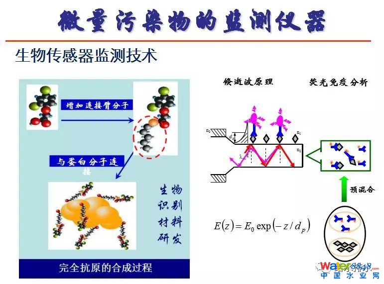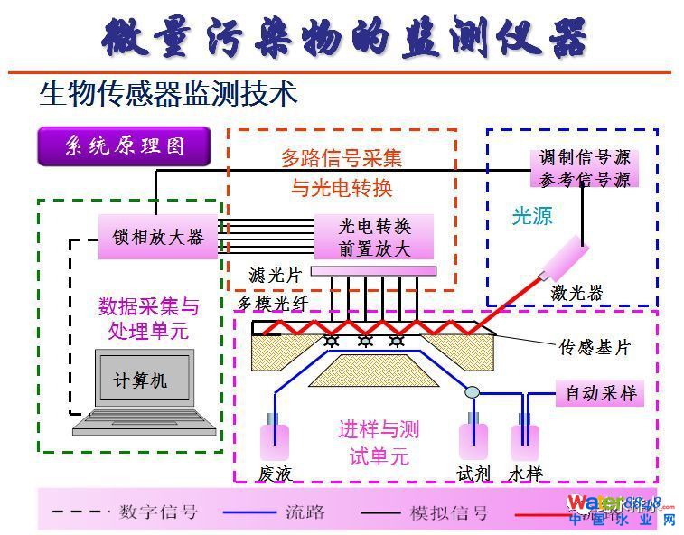 微量污染物可以用生物傳感器監(jiān)測技術(shù),在芯片表面,激光鏡產(chǎn)生V的能量,芯片表面消失了敏感物質(zhì),進來的水樣經(jīng)過,比如說抗體和核算標(biāo)記的進行反應(yīng),反應(yīng)以后流過界面,表面就會把這些污染物識別的材料固定,固定以后,如果有激光進來就會發(fā)生熒光,熒光可以被測定。