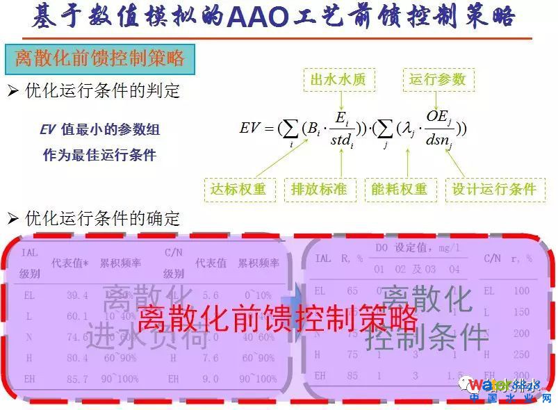 經(jīng)常有人問ICA的控制模型能不能用在污水處理上。ICA是很好的原理模型,但是很復(fù)雜,這樣的模型不能直接用在污水廠的PRC控制,我們現(xiàn)在用的PRC控制系統(tǒng)沒有這么強的計算能力,用IAL模型,可以做運行的條件,有了運行條件以后,將其離散。污水廠實際的調(diào)整不是實時在那不斷調(diào),按點調(diào)不可能,所以離散化變成階段條件,一段負荷是一個運行調(diào)劑,形成離散負荷條件。根據(jù)離散負荷條件,做出離散運行因素條件,這樣形成控制模型。這個模型按照常理的POC,這么多年我們基本做的這樣一種模型。
