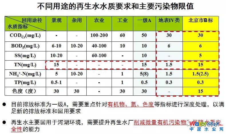 長期以來,不斷有一些新的排放標(biāo)準(zhǔn)推出,包括原來2002年推出的GB18918標(biāo)準(zhǔn),還有地方標(biāo)準(zhǔn)嚴于國家標(biāo)準(zhǔn)的情況,原來一直說國家標(biāo)準(zhǔn)是一刀切,可現(xiàn)在北京、天津、江蘇、合肥的地方標(biāo)準(zhǔn)都比國標(biāo)還高。這些標(biāo)準(zhǔn)里,氮磷控制比原來一級A要嚴,COD也從一級A的50降到30甚至20。從環(huán)境風(fēng)險和環(huán)境健康角度去看,這部分其實除了對有機物耗氧考慮,還有微量污染物的環(huán)境風(fēng)險考慮。之前一級A的標(biāo)準(zhǔn)是為了滿足再生水的要求,現(xiàn)在新的再生水標(biāo)準(zhǔn)也在制定之中,會進一步推進我們水處理技術(shù)發(fā)展。