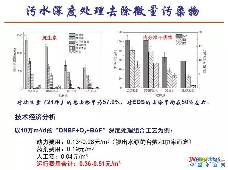 以江蘇某廠為例,進水COD濃度在200、300mg/L,TN濃度在30、40mg/L條件下,出水TN濃度可達到10mg/L,COD可以小于30mg/L。微量污染物方面,對于24種抗生素,測定可以達到57%的去除率,對內(nèi)分泌干擾物也可以達到一半以上。當(dāng)然這樣的深度處理會增加成本,根據(jù)水質(zhì)的不同,運行成本的增加大概在每噸水0.3~0.5元的水平。
