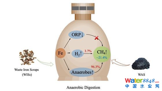 北京建筑大學(xué)郝曉地教授團隊——廢鐵屑強化剩余污泥厭氧消化機理研究 投加廢鐵屑可促進厭氧消化甲烷產(chǎn)量 定量分析廢鐵屑促使甲烷增產(chǎn)之作用機理 廢鐵屑通過降低ORP和鐵腐蝕析H2兩種途徑對甲烷增產(chǎn)貢獻甚
