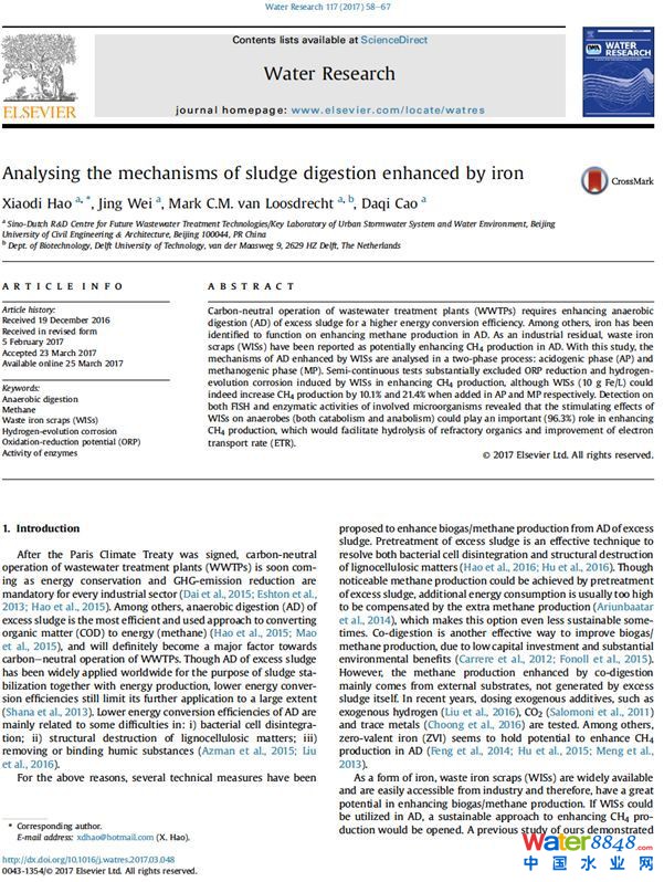 北京建筑大學(xué)郝曉地教授團隊——廢鐵屑強化剩余污泥厭氧消化機理研究