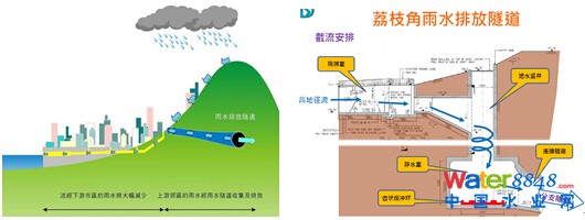 以位于九龍西北部的荔枝角雨水排水隧道為例,工程主要采用半山截流的方法,截取雨水,經分支隧道流入靜水池,再經主隧道排到海港,為荔枝角、深水埗、長沙灣等下游區(qū)域提供了防洪保障。傳統(tǒng)的防洪方法是在市區(qū)拓建排水管道,而隧道截流是創(chuàng)新的防洪方法,它從源頭著手,建造雨水排放隧道,在半山截流雨水,再繞過稠密的下游市區(qū),直接排放入海。該工程于2008年至2012年建成。