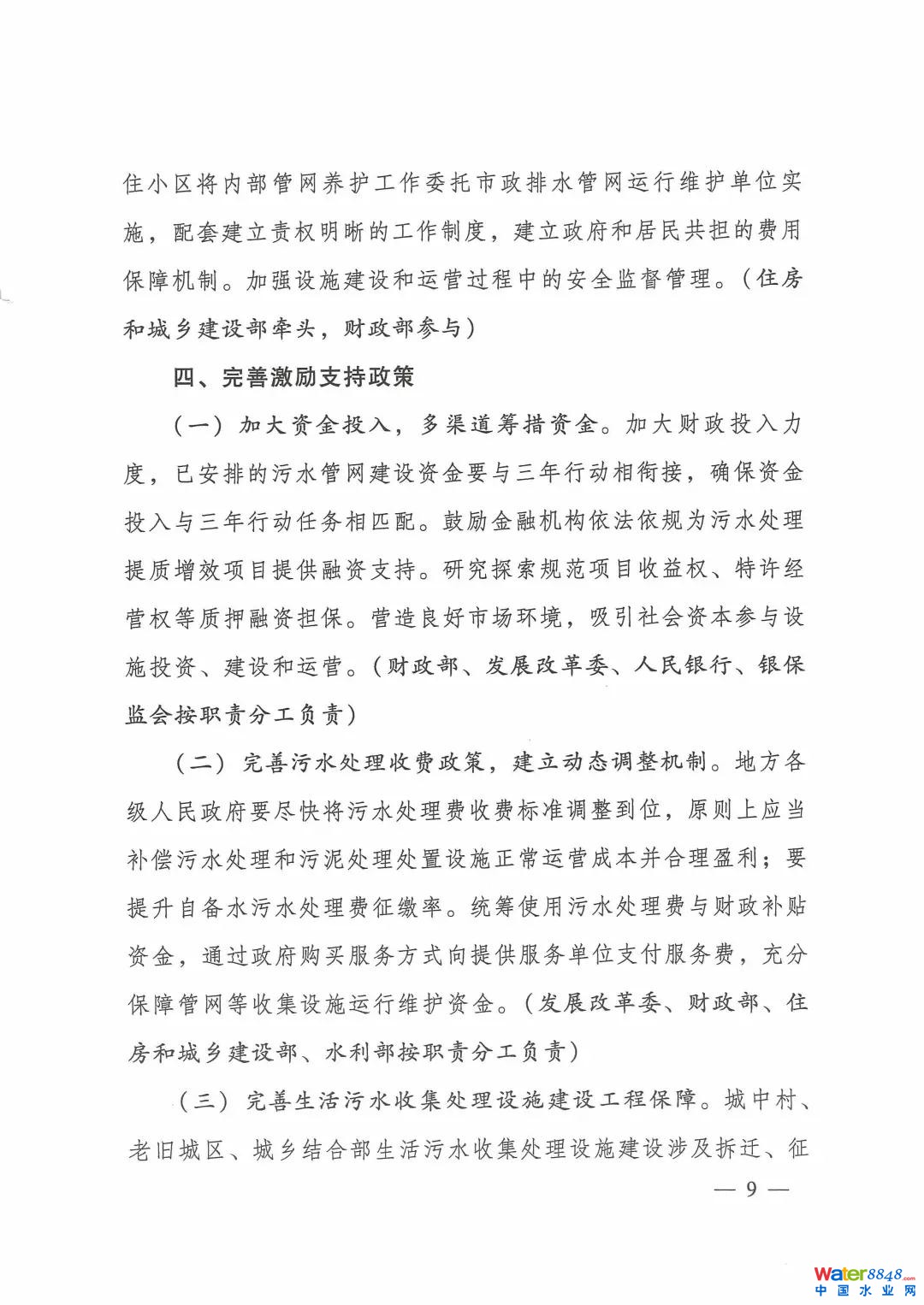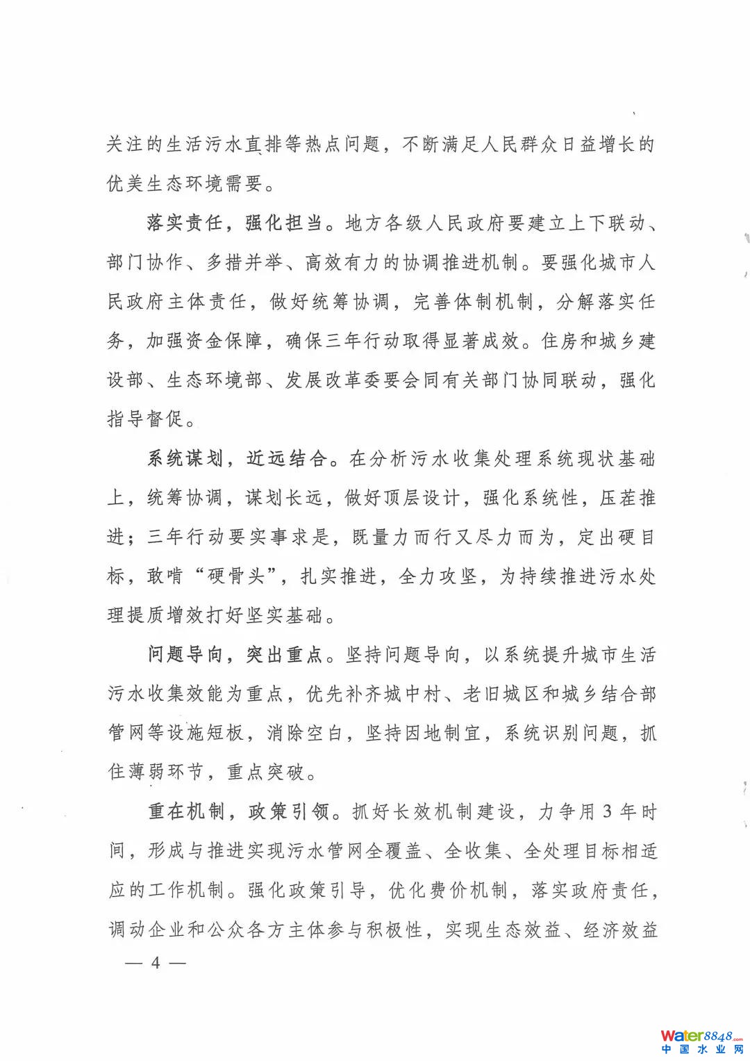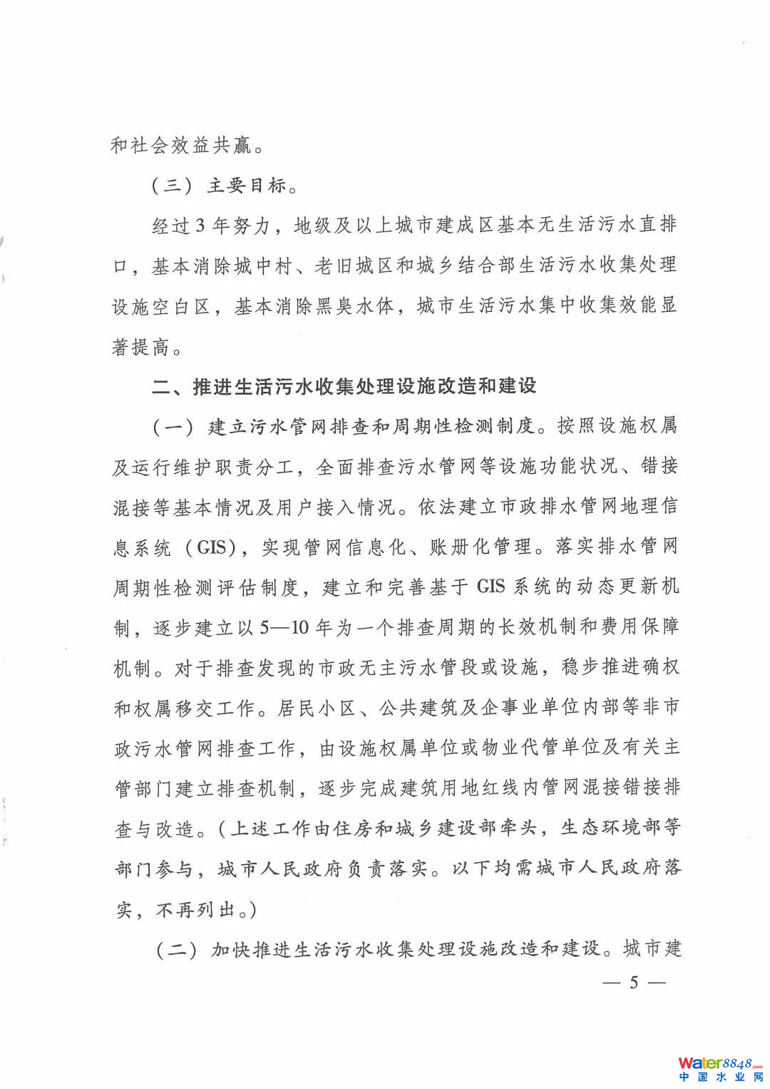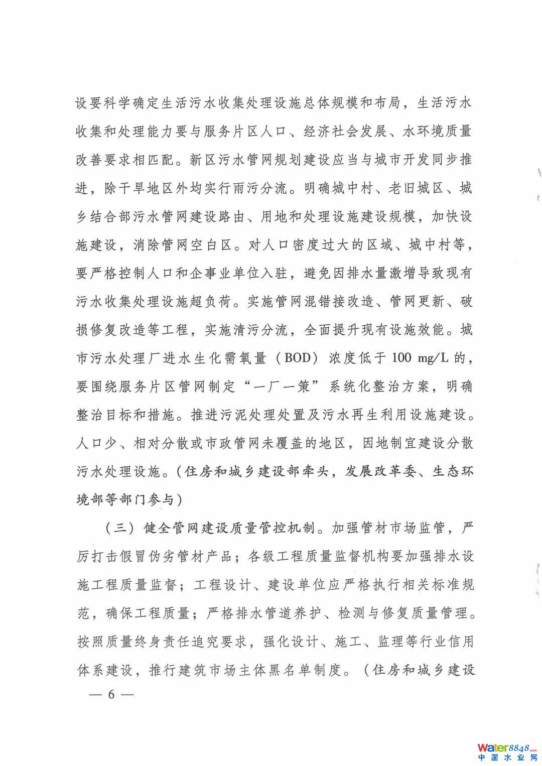 方案要求城市設(shè)要科學(xué)確定生活污水收集處理設(shè)施總體規(guī)模和布局,生活污水收集和處理能力要與服務(wù)片區(qū)人口、經(jīng)濟(jì)社會(huì)發(fā)展、水環(huán)境質(zhì)量改善要求相匹配。新區(qū)污水管網(wǎng)規(guī)劃建設(shè)應(yīng)當(dāng)與城市開(kāi)發(fā)同步推進(jìn),除干旱地區(qū)外均實(shí)行雨污分流。明確城中村、老舊城區(qū)、城鄉(xiāng)結(jié)合部污水管網(wǎng)建設(shè)路由、用地和處理設(shè)施建設(shè)規(guī)模,加快設(shè)施建設(shè),消除管網(wǎng)空白區(qū)。對(duì)人口密度過(guò)大的區(qū)域、城中村等,要嚴(yán)格控制人口和企事業(yè)單位入駐,避免因排水量激增導(dǎo)致現(xiàn)有污水收集處理設(shè)施超負(fù)荷。實(shí)施管網(wǎng)混錯(cuò)接改造、管網(wǎng)更新、破損修復(fù)改造等工程,實(shí)施清污分流,全面提升現(xiàn)有設(shè)施效能。城市污水處理廠進(jìn)水生化需氧量(BOD)濃度低于100mg/L的,要圍繞服務(wù)片區(qū)管網(wǎng)制定“一廠一策”系統(tǒng)化整治方案,明確整治目標(biāo)和措施。推進(jìn)污泥處理處置及污水再生利用設(shè)施建設(shè)。人口少、相對(duì)分散或市政管網(wǎng)未覆蓋的地區(qū),因地制宜建設(shè)分散污水處理設(shè)施。原文如下: