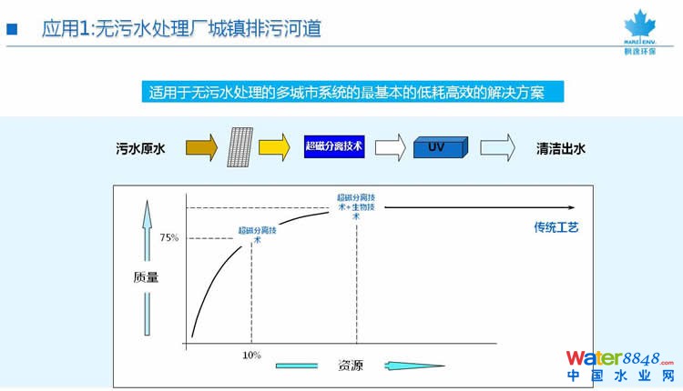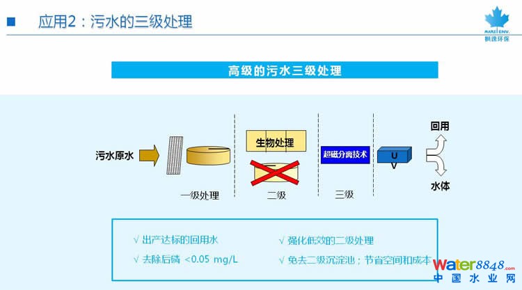 超磁過濾技術(shù)應(yīng)用領(lǐng)域 技術(shù)可應(yīng)用于水處理的多個領(lǐng)域 1、對無污水處理的城鎮(zhèn)是一個必然的低成本解決方案 2、是凈化污水用于再循環(huán)/再生水三級處理的最佳工藝 3、是替代傳統(tǒng)一級和二級澄清的優(yōu)選技