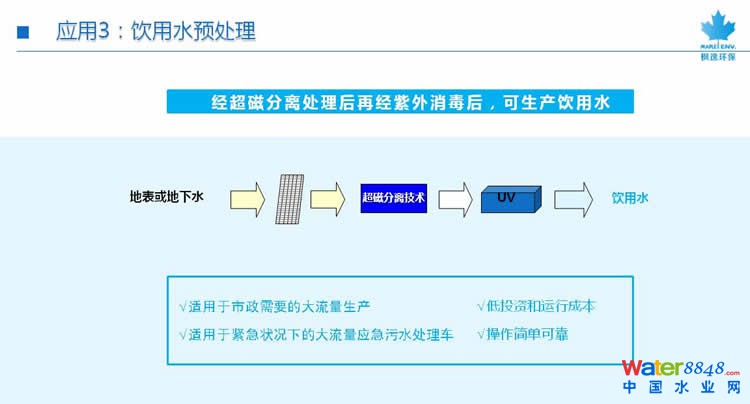核心提示:超磁過濾技術(shù)應(yīng)用領(lǐng)域 技術(shù)可應(yīng)用于水處理的多個領(lǐng)域 1、對無污水處理的城鎮(zhèn)是一個必然的低成本解決方案 2、是凈化污水用于再循環(huán)/再生水三級處理的最佳工藝 3、是替代傳統(tǒng)一級和二級澄清的優(yōu)選技術(shù) 4、經(jīng)紫外線處理后,適用于飲用水、城市用水、工業(yè)用水和緊急用水 5、高性能,是混合污水管道的低成本解決方案 6、工業(yè)工藝用水和污水處理