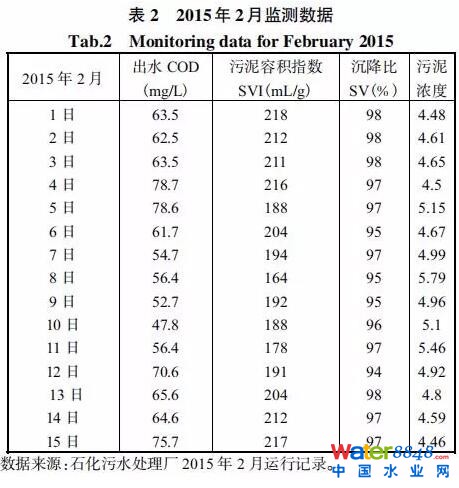 這說明污泥受到?jīng)_擊,污泥濃度明顯下降,污泥指數(shù)顯著增加,導(dǎo)致出水超標(biāo)。2015年2月初系統(tǒng)逐步恢復(fù)穩(wěn)定,外排COD指標(biāo)已明顯好轉(zhuǎn)。但從生物相分析:3日污泥呈淺褐色,有大量表殼蟲、單個(gè)不活躍鐘蟲,少量絲狀細(xì)菌,菌膠團(tuán)結(jié)構(gòu)松散;5日污泥呈褐色,有大量表殼蟲、一定量不活躍鐘蟲,較多絲狀細(xì)菌,菌膠團(tuán)結(jié)構(gòu)松散;10日污泥呈較深的褐色,有大量表殼蟲、少量活躍蟲,較多絲狀細(xì)菌,菌膠團(tuán)結(jié)構(gòu)松散。這表明污泥系統(tǒng)尚未恢復(fù)良好狀態(tài),其恢復(fù)的真正標(biāo)志是污泥生物系統(tǒng)發(fā)生改善和污泥濃度特別是污泥容積指數(shù)的恢復(fù)。另外,從表2可以看出,污泥指數(shù)的變化趨勢與出水COD的變化趨勢在一定范圍內(nèi)基本相同,且具有相關(guān)性。為此,在實(shí)際的生產(chǎn)運(yùn)行中,將污泥濃度、污泥沉降比SV、污泥容積指數(shù)SVI和生物相作為日常監(jiān)測項(xiàng)目進(jìn)行必要的監(jiān)測,同時(shí)對(duì)測定結(jié)果進(jìn)行科學(xué)的綜合分析評(píng)價(jià),據(jù)此指導(dǎo)污水裝置的運(yùn)行與調(diào)整。