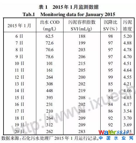 2015年1月由于前方廠生產(chǎn)裝置出現(xiàn)事故,一定量高濃度廢水從原有的高濃度污水管線轉(zhuǎn)移到生活管線排放,雖然進(jìn)水COD沒有明顯增大,但因缺少預(yù)處理,部分難降解有機(jī)物對(duì)純氧曝氣活性污泥有較大的影響,具體數(shù)據(jù)見表1。