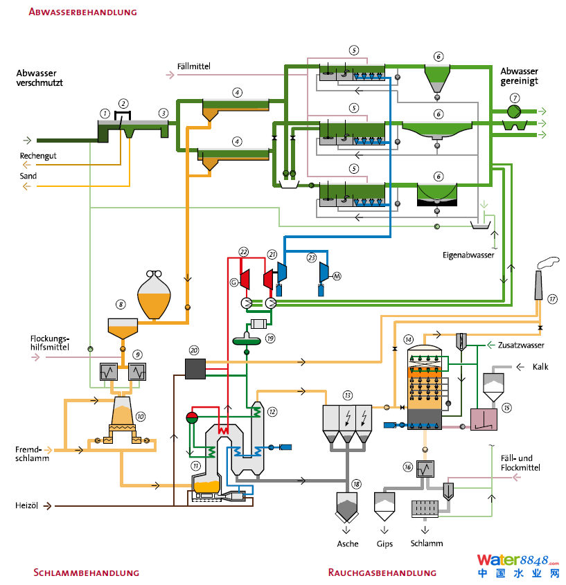 Ruhleben污水廠主要由三大功能單元組成,污水處理單元,污泥處理單元和煙氣處理單元。而其中的污水處理單元又包含了機(jī)械處理和生化處理部分。