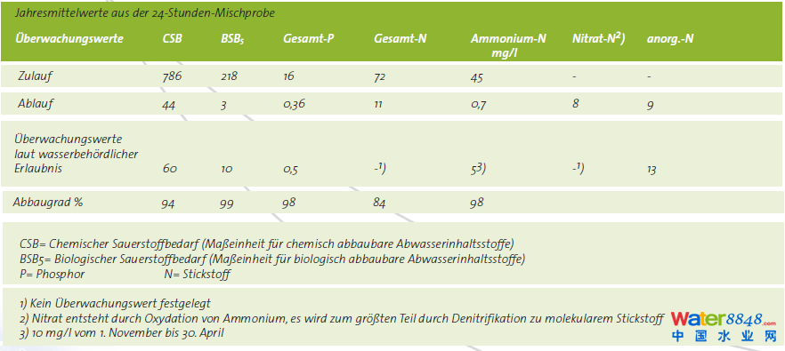 在生化處理環(huán)節(jié),水中的懸浮物,溶解的有機(jī)物以及溶解的無機(jī)物將會(huì)被微生物的新陳代謝過程去除。無機(jī)物的進(jìn)一步去除,是通過特殊的生化反應(yīng),或是投加一定的化學(xué)藥劑實(shí)現(xiàn)的。Ruhleben污水廠的出水中,總磷遠(yuǎn)遠(yuǎn)低于規(guī)定的0.5 mg/L,氨氮低于5 mg/L,總氮低于13 mg/L。Ruhleben污水廠用三組生化池,分別為一組6個(gè)(運(yùn)行水位3.15 m,容積52500 m3),一組6個(gè)(運(yùn)行水位5.15 m,容積84000 m3),一組4個(gè)(運(yùn)行水位厭氧缺氧區(qū)8.15 m,好氧區(qū)5.65 m,容積62000 m3)。