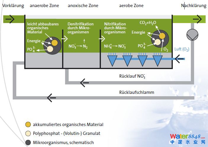 當(dāng)污水在排水管網(wǎng)中,或者一些特定的池體中停留一定的時(shí)間,就會(huì)在其中產(chǎn)生可輕易降解的有機(jī)酸。這些有機(jī)酸可以被微生物(PAO)吸收并轉(zhuǎn)換成生物內(nèi)的能量?jī)?chǔ)存物質(zhì)。該合成過程所需的能量來自分解儲(chǔ)存在細(xì)胞內(nèi)的多磷酸鹽,同時(shí)多磷酸鹽也作為能量來源,支撐細(xì)胞在厭氧環(huán)境中的生存。在好氧環(huán)境下,這些之前在厭氧環(huán)境中合成的能量?jī)?chǔ)存物質(zhì)以及外部可輕易降解的底物,將會(huì)作為細(xì)胞繁殖的能量源。通過利用內(nèi)部的能量?jī)?chǔ)存物質(zhì),可以使細(xì)胞快速的適應(yīng)好氧環(huán)境,同時(shí)立刻開始新陳代謝和生長(zhǎng)。通過這樣的方式,使得微生物開始吸收水中的磷酸鹽,并將其儲(chǔ)存為多磷酸鹽。并且在好氧環(huán)境下所吸收的磷酸鹽要遠(yuǎn)遠(yuǎn)多于在厭氧環(huán)境中釋放的磷酸鹽,以此達(dá)到除磷的效果。