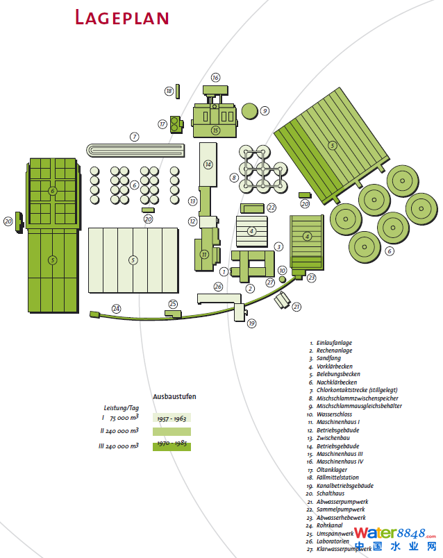 通過現(xiàn)如今的污水廠平面布置圖,我們可以清晰的辨別,污水廠在不同時(shí)期分別進(jìn)行了怎樣的改造升級(jí), 同時(shí)我們也會(huì)發(fā)現(xiàn),對(duì)于同一處理單元,污水廠也使用了不同的處理工藝。污水廠之所以要如此升級(jí)擴(kuò)建,是為了與柏林的人口規(guī)模相適應(yīng),同時(shí)也不斷的滿足水務(wù)管理部門提出的更加嚴(yán)苛的出水標(biāo)準(zhǔn)。