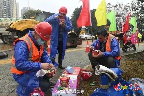 在武漢小湯山模式醫(yī)院建設現(xiàn)場,一群施工者們正在吃著方便面做午餐。
