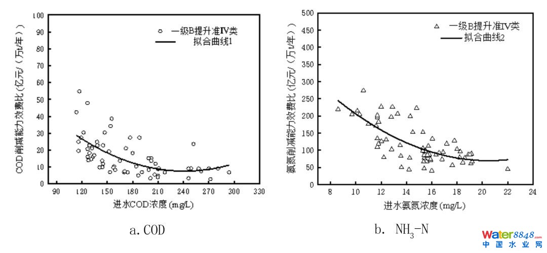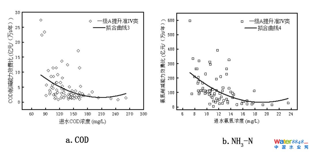 理想情況下的城鎮(zhèn)污水處理提質(zhì)增效投入分析結(jié)果顯示,提高污水管網(wǎng)覆蓋率以及老舊污水管網(wǎng)改造和破損修復(fù)能夠顯著提升城鎮(zhèn)污水處理廠COD、氨氮削減效能。通過(guò)對(duì)各城鎮(zhèn)污水處理廠實(shí)際運(yùn)行中進(jìn)水COD、氨氮濃度與投入產(chǎn)出費(fèi)效比進(jìn)行曲線擬合,分析東莞市污水處理提質(zhì)增效側(cè)重點(diǎn)。東莞市執(zhí)行一級(jí)B和一級(jí)A標(biāo)準(zhǔn)的城鎮(zhèn)污水處理廠提升至準(zhǔn)Ⅳ類(lèi),擬合結(jié)果如圖1、2所示。