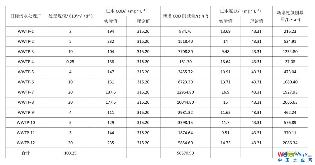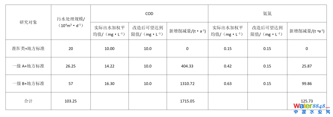 各目標(biāo)污水處理廠實(shí)際執(zhí)行的出水標(biāo)準(zhǔn),分為“準(zhǔn)Ⅳ類(lèi)+地方標(biāo)準(zhǔn)” “一級(jí)A+地方標(biāo)準(zhǔn)”和“一級(jí)B+地方標(biāo)準(zhǔn)”三類(lèi),對(duì)應(yīng)的污水處理規(guī)模分別為20×10 426.25×10 457×10 4m3/d。根據(jù)陳瑋等的研究方法,計(jì)算得出12座城鎮(zhèn)污水處理廠提標(biāo)改造新增污染物削減量理論值,結(jié)果見(jiàn)表2。