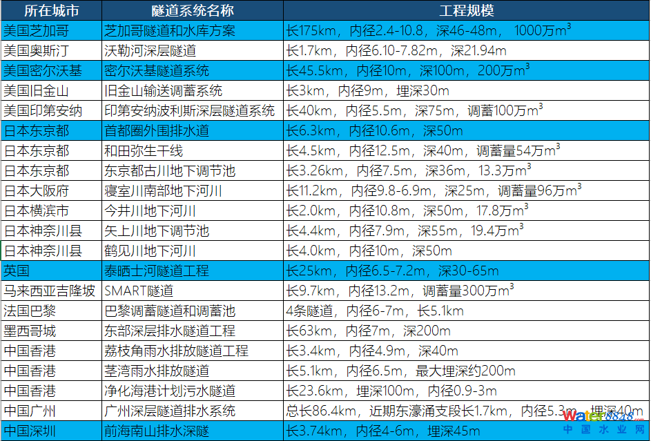 深隧排水系統(tǒng)是城市防澇和控污的重要工程措施之一,具有建設(shè)施工影響小、可有效調(diào)控城市徑流等優(yōu)勢,能夠克服高密度建成區(qū)淺層管網(wǎng)改造等困難,在緩解城市內(nèi)澇、控制初雨污染等方面發(fā)揮積極作用。國外的排水管網(wǎng)建設(shè)經(jīng)驗表明,城市深隧排水系統(tǒng)是一種能夠有效緩解城市內(nèi)澇問題、解決雨洪和溢流污染的重要措施.該系統(tǒng)在國外多個國家已經(jīng)有了較為成熟的應(yīng)用。