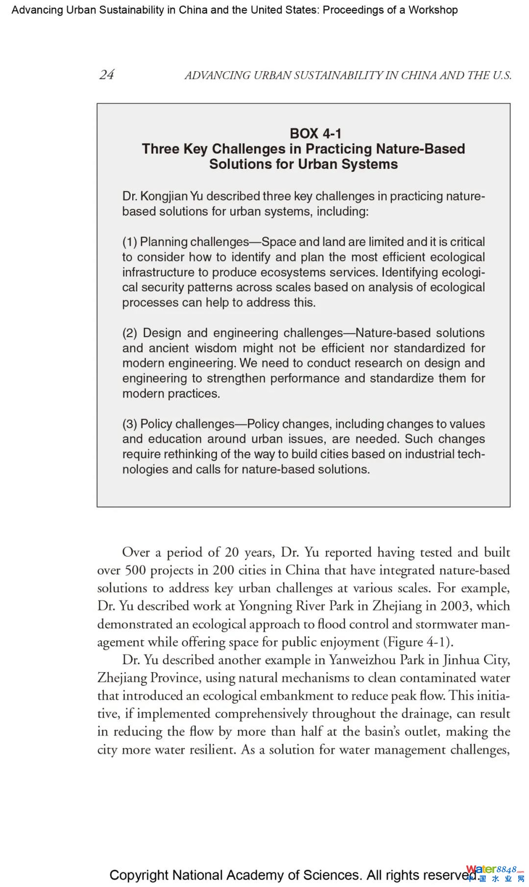 在關(guān)于中美兩國的建筑、城市設(shè)計(jì)和可持續(xù)城市的主題研討中,與會(huì)人員著重討論了基于自然的解決途徑和海綿城市研究。報(bào)告指出,俞孔堅(jiān)所倡導(dǎo)的基于自然的解決途徑對(duì)于城市可持續(xù)發(fā)展至關(guān)重要。中國大部分城市都面臨著一系列復(fù)雜的生態(tài)和環(huán)境問題:洪水、城市內(nèi)澇、干旱、地下水減少、水污染、空氣污染、棲息地減少等,而目前的灰色基礎(chǔ)設(shè)施不足以解決這些相互關(guān)聯(lián)的問題。他提倡復(fù)興中國傳統(tǒng)農(nóng)業(yè)智慧,探索用生態(tài)學(xué)原理和景觀設(shè)計(jì)學(xué)的方法進(jìn)行城市防洪和雨洪管理,建設(shè)水韌性城市,進(jìn)行生態(tài)水凈化和生態(tài)修復(fù)。