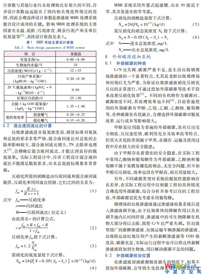 MBR系統(tǒng)是垃圾滲濾液處理的核心,其設(shè)計(jì)對整個滲濾液處理系統(tǒng)穩(wěn)定達(dá)標(biāo)排放至關(guān)重要。MBR生化處理系統(tǒng)的設(shè)計(jì)應(yīng)以COD進(jìn)行計(jì)算;規(guī)模較小時可以采用一條線(一套處理系統(tǒng)),規(guī)模較大時需設(shè)置二條線(并聯(lián)的兩套處理系統(tǒng)),對滲濾液處理出水總氮無要求時采用單級生物脫氮,對出水總氮有要求時采用二級生物脫氮;設(shè)計(jì)中應(yīng)合理選取水溫、泥齡、污泥濃度、剩余污泥產(chǎn)率及單位耗氧量等參數(shù),通過計(jì)算確定混合液回流比,外加碳源可以采用甲醇、乙酸鈉、葡萄糖等,分別投加在缺氧池和后置反硝化池;通過控制生物池內(nèi)水的流態(tài)、利用空氣管道控制曝氣區(qū)域、控制膜分離和污水冷卻系統(tǒng)回流位置等技術(shù)措施,可以取得良好的處理效果。