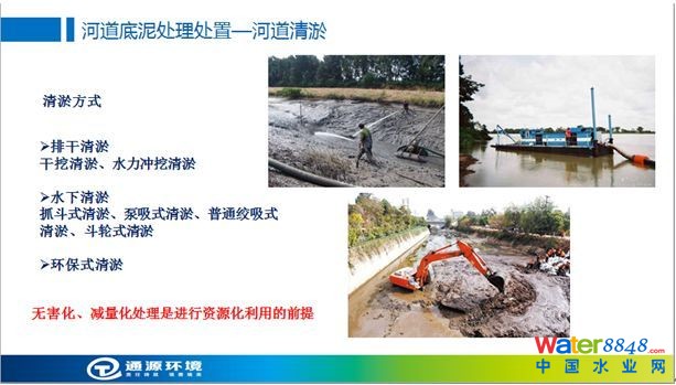 河道底泥處置中,“無害化、減量化”處理是進行資源化利用的前提。通源環(huán)境采取“排干清淤、水下清淤、環(huán)保式清淤” 等方式進行河道清淤。