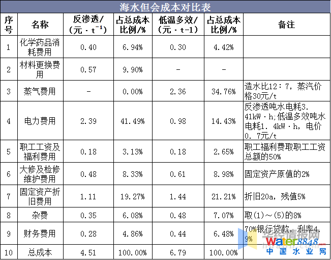 根據(jù)目前國內(nèi)的技術(shù)水平和條件,以1萬t/d反滲透海水淡化工程和低溫多效海水淡化工程為例進行海水淡化成本的測算,具體成本為: