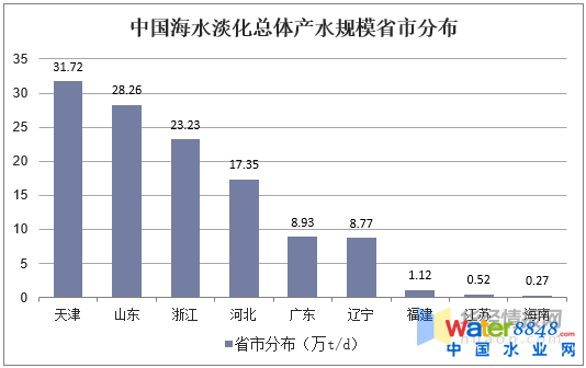 截至2018年底,中國海水淡化項目主要分布在沿海9個。ㄊ校,產(chǎn)水規(guī)模排前三的分別為天津、山東、浙江省,產(chǎn)水規(guī)模分別為31.72萬t/d、28.26萬t/d、23.23萬t/d。