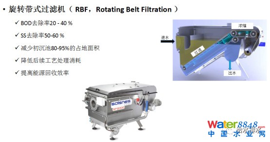 在污水處理領(lǐng)域近些年一個(gè)重要的動(dòng)向是一級(jí)處理技術(shù)的發(fā)展,出現(xiàn)了幾個(gè)新的工藝。第一個(gè)是旋轉(zhuǎn)帶式過濾機(jī)(RBF),占地面積非常小,只占初沉池面積的10%左右,效率和初沉池的效率差不多,BOD去除率約20~30%、SS去除率約50~60%。