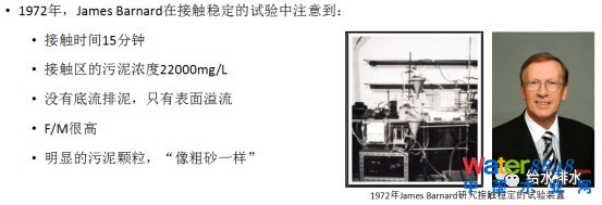 現(xiàn)在談?wù)劥蠹冶容^關(guān)注多的好氧顆粒污泥技術(shù),實(shí)際上在活性污泥工藝發(fā)展的歷史中有人就觀察到了顆粒污泥的現(xiàn)象。比如70年代的時(shí)候James Barnard在接觸穩(wěn)定的試驗(yàn)中注意到,接觸區(qū)的污泥濃度只有22000mg/L,接觸時(shí)間15分鐘,沒有底流排泥,Barnard觀察到了明顯的顆粒污泥現(xiàn)象,像“粗砂”一樣。