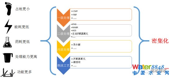 從過去這100年的污水處理技術(shù)發(fā)展歷程來看,污水處理技術(shù)正朝著越來越“密集化(Intensification)”的方向發(fā)展。密集化這個(gè)概念實(shí)際上是一個(gè)化工行業(yè)的術(shù)語,它是強(qiáng)調(diào)以化工原理和反應(yīng)工程以及相關(guān)平衡特性為基礎(chǔ),通過采用新設(shè)備、新工藝,顯著提升反應(yīng)的過程速率,使工廠布局更加緊湊,提升能量效率,減少廢物排放。Intensification這個(gè)詞的中文翻譯有強(qiáng)化的意思,但我覺得這個(gè)強(qiáng)化和污水處理技術(shù)領(lǐng)域經(jīng)常提到的一級(jí)強(qiáng)化處理(CEPT)、強(qiáng)化生物除磷(EBPR)還不是完全一樣。Intensifcation稱之為密集化可能更合適一些,它的意思是工藝的發(fā)展將會(huì)使占地面積更小、能耗更低、處理能力更強(qiáng)、功能更多,下面通過幾個(gè)具體的技術(shù)來闡述密集化的概念。