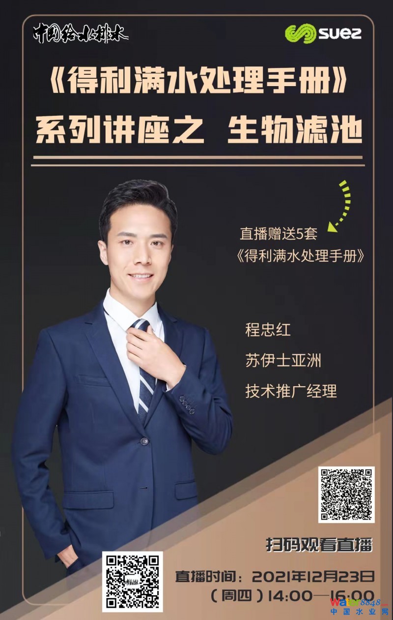 核心提示:直播時(shí)間:2021年12月23日下午14:00-16:00(周四) 題目:《得利滿水處理手冊(cè)》 系列講座 之 生物濾池 程忠紅 蘇伊士亞洲 技術(shù)推廣經(jīng)理 課程內(nèi)容包括十多種生物濾池介紹: · 蘇伊士第六代生物濾池首發(fā)介紹 · 4種Biofor 生物濾池 · 2種反硝化深床濾池 · 2種預(yù)曝氣型好氧生物濾池 · 2種飲用水除氮生物濾池 應(yīng)用案例涉及飲用水除氮、污水二級(jí)處理、深度處理脫氮、工業(yè)廢水處