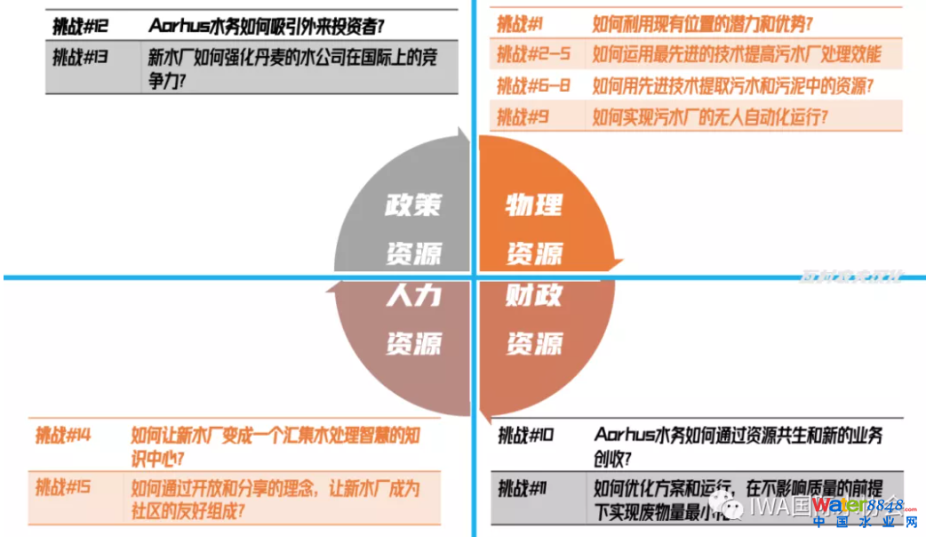 對與新水廠建設(shè)相關(guān)的潛在創(chuàng)新進(jìn)行全方位分析,并以此作為策略制定的基礎(chǔ)。根據(jù)這全方位分析,他們將15個(gè)挑戰(zhàn)問題分成了四大類別,如下圖所示: