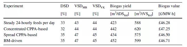 對(duì)比后發(fā)現(xiàn),三種針對(duì)電價(jià)高峰設(shè)定的污泥進(jìn)料模式下,單位有機(jī)物的產(chǎn)甲烷率有所提升,生物沼氣產(chǎn)量平均要比要比污泥全天均勻進(jìn)料的常規(guī)模式高4%,生物沼氣經(jīng)濟(jì)價(jià)值可提升2%