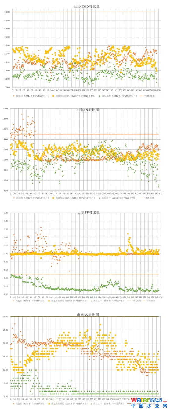 本項(xiàng)目完成改造后出水全面優(yōu)于一級A標(biāo),較好的達(dá)到了工程目標(biāo),其改造前、改造中、改造后的出水水質(zhì)對比如下圖所示: