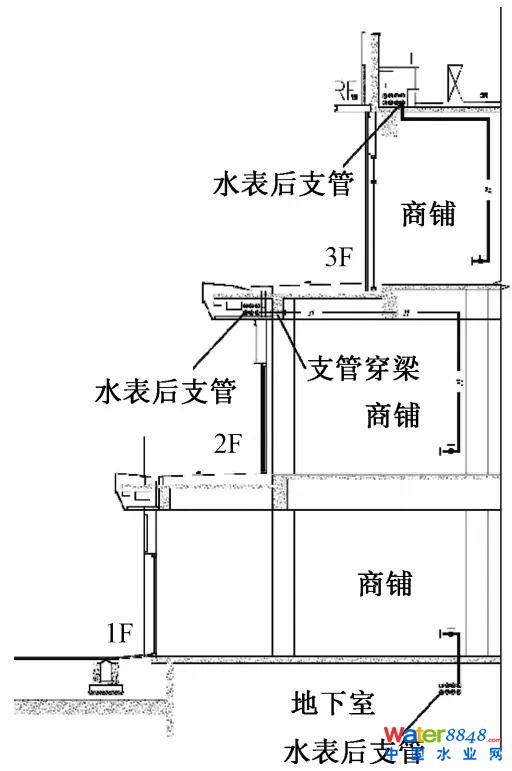 為滿足招商的多元化以及不確定性,商管通常要求各商鋪盡可能預(yù)留上下水、餐飲條件。由于商鋪數(shù)量繁多,室內(nèi)公區(qū)極少,給水管線路由和分戶水表設(shè)置的位置成為一個難題。本文認(rèn)為可分為兩種情況確定不同的設(shè)計方案: