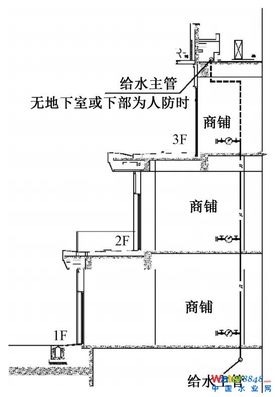 1)水表戶內(nèi)設(shè)置。此種方案將水表設(shè)置在鋪內(nèi),低位安裝,水表應(yīng)采用遠(yuǎn)傳型或插卡型以方便抄表。有地下室時可將給水干管設(shè)置于地下室,通過分立管形式入戶;無地下室或下部為人防時可在屋頂設(shè)置機(jī)電管廊,給水干管設(shè)置于管廊內(nèi),支管下穿屋面入戶,給水管置于屋面時需根據(jù)當(dāng)?shù)貧夂蛱卣鞑扇∮行У姆纼霰卮胧瑖?yán)寒或寒冷地區(qū)干管可設(shè)置于頂層商鋪內(nèi)。此方案典型設(shè)計如圖1所示。