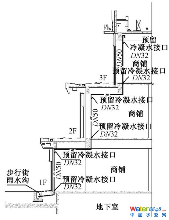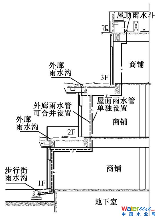 室外商業(yè)步行街雨水排水及其復(fù)雜,屋頂、各層的外廊、1層內(nèi)街均需要考慮雨水排水。有相當(dāng)一部分設(shè)計院在設(shè)計此類商業(yè)時將雨水分段散排至下層屋面,如此設(shè)計確實簡便,但給今后商業(yè)的運營安全帶來諸多隱患。