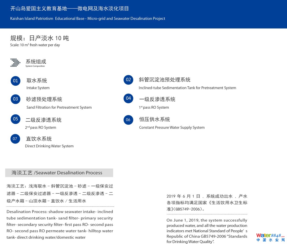 為滿足連云港開山島的用電用水需求,2019年初,豐海公司前后經(jīng)過多次現(xiàn)場考察、會議研討,為該島設(shè)計和生產(chǎn)了一套日產(chǎn)10噸的海水淡化設(shè)備。該項目利用太陽能、風(fēng)能,并整合島上現(xiàn)有供水、供電方式,解決島上生活用水及用電緊缺問題。5月8日,項目正式開工建設(shè),6月1日成功出水。開山島項目以清潔、綠色的方式滿足電力需求,海水淡化系統(tǒng)將徹底解決守島人“看天吃水、船拉人扛”的用水難題。