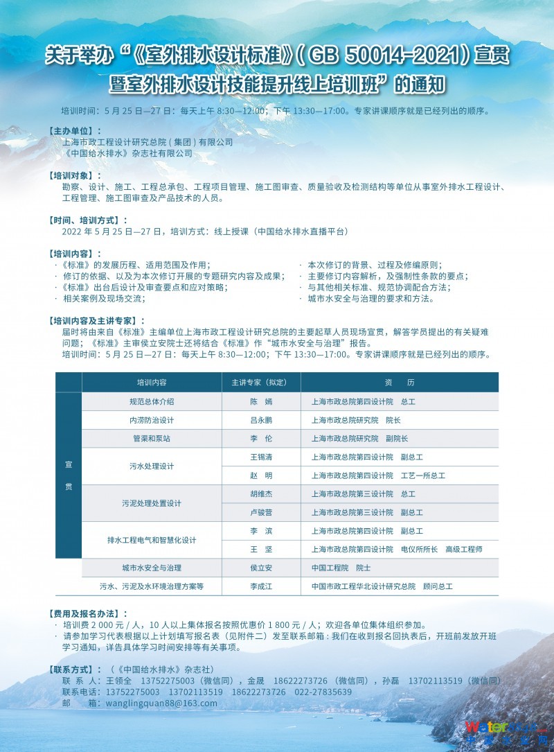 中國給水排水直播:智慧水務(wù)與科技創(chuàng)新高峰論壇 直播時(shí)間:2023年11月25日(周六) 13:30 2023-11-25 13:30:00 開始 中國水協(xié)團(tuán)體標(biāo)準(zhǔn)《城鎮(zhèn)污水資源與能源回收利用技術(shù)規(guī)程》宣貫會(huì)通知 中國城鎮(zhèn)供水排水協(xié)會(huì)