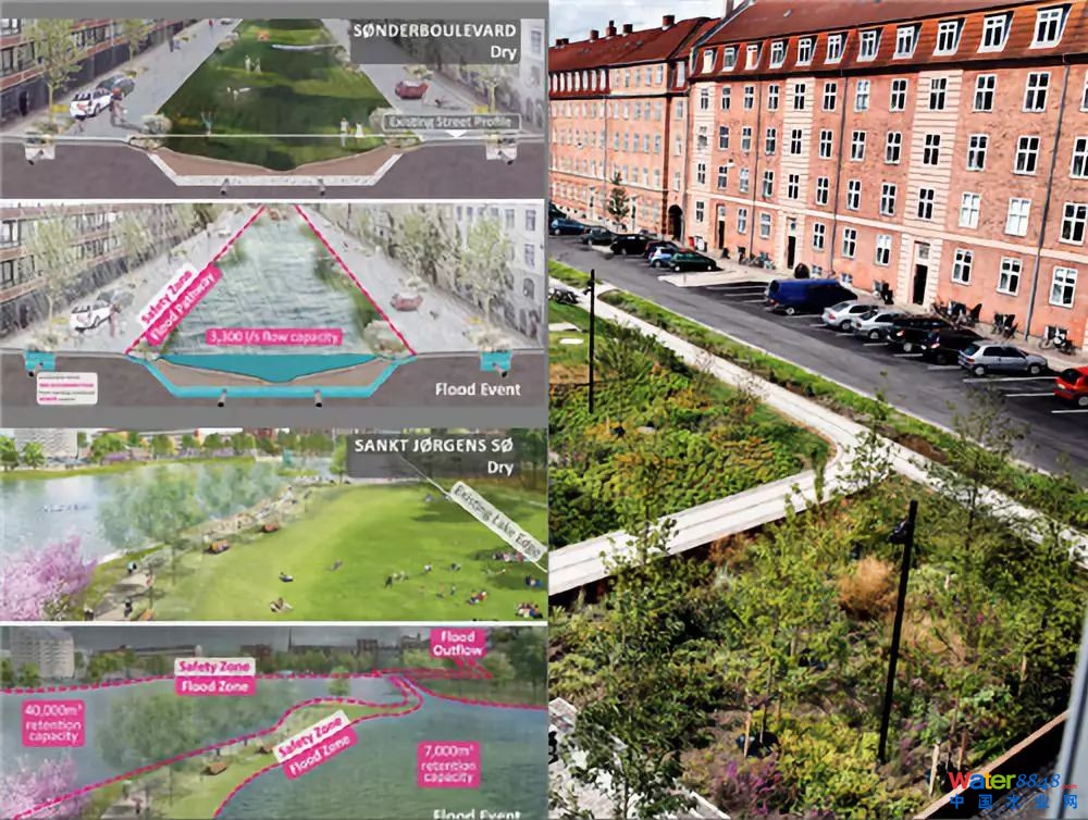 2011年,丹麥哥本哈根經(jīng)歷了一場非常嚴重的洪災,洪災之后的重建費用大概花了9億歐元。哥本哈根對這次洪災的應對是重新制訂了暴雨計劃,利用藍色、綠色、灰色基礎設施融合的方法提高城市復原能力,進行藍綠改造。