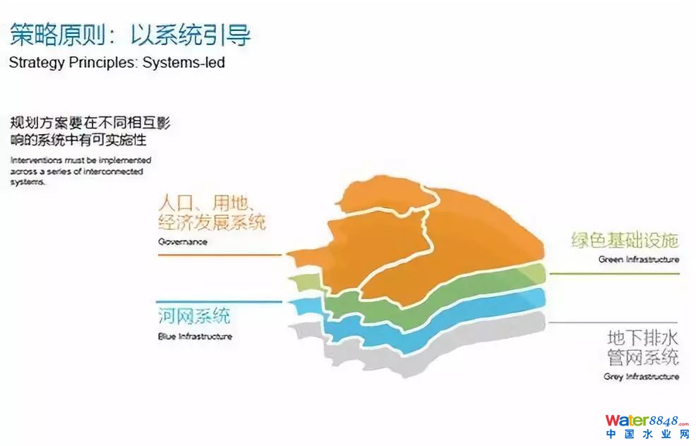 通過以往的項目經(jīng)驗所制定的四個關鍵原則驅動。以系統(tǒng)引導的工作方法,制定藍綠基礎設施的實施。策略制定和實施的關鍵就是現(xiàn)有排水系統(tǒng)的治理,另外還有藍、綠、灰色基礎設施。