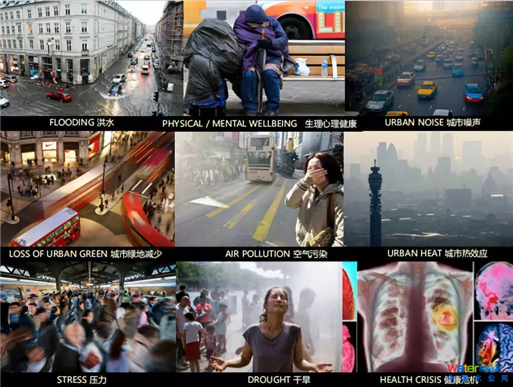 城市化、氣侯變化、老化的基礎設施,都對水管理構成了挑戰(zhàn)。目前世界城市人口已經(jīng)達到空前數(shù)量,給城市帶來了巨大的壓力,引發(fā)了全球性的身心健康危機,造成巨大的財政負擔。氣侯變化引起了很多問題,其中一項就是水的問題,包括城市內澇和水資源短缺的問題,傳統(tǒng)的水管理方法需要被重新審視,以適應這些變化。
