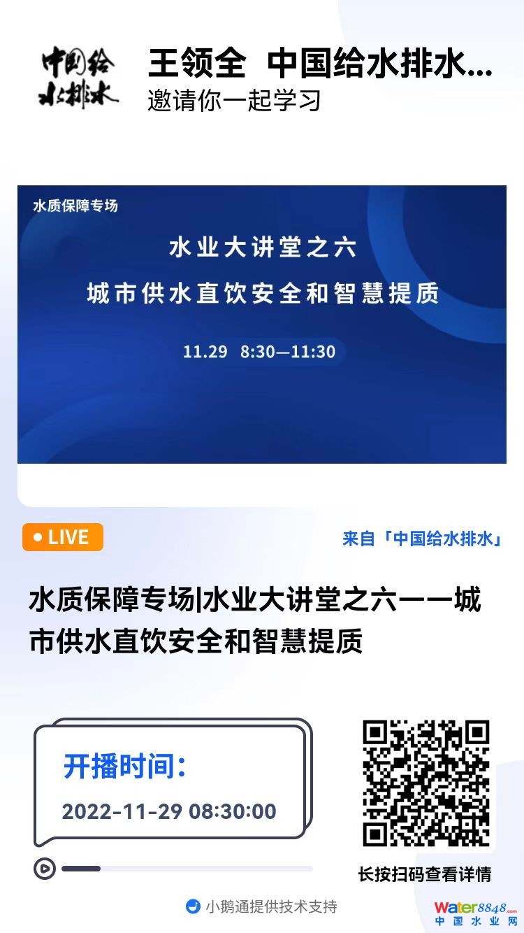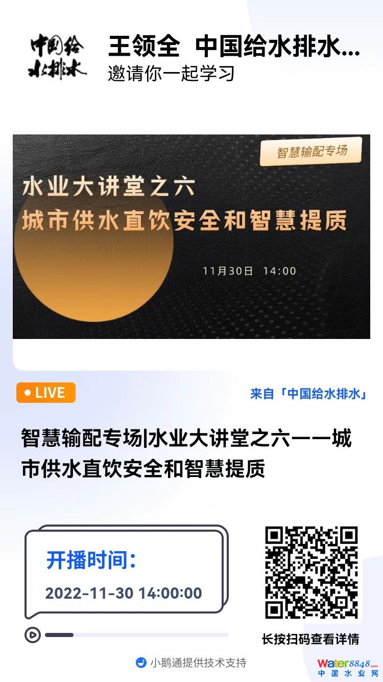 轉(zhuǎn)發(fā)直播贈送 中國給水排水電子期刊 。!為貫徹新發(fā)展理念和創(chuàng)新驅(qū)動發(fā)展戰(zhàn)略,推進水資源的集約安全利用,倡導“以人為本”與可持續(xù)發(fā)展,加強供水全生命周期的科學管理,由中國土木工程學會水工業(yè)分會主辦,上海市政工程設計研究總院(集團)有限公司承辦的“水業(yè)大講堂之六——城市供水直飲安全和智慧提質(zhì)”主題會議擬定于 2022年11月29日至12月7日舉行。綜合考慮到高效統(tǒng)籌疫情防控和經(jīng)濟社會發(fā)展并行,此次水業(yè)大講堂會議采用線上會議方式。在此,希望各位收到會議通知和邀請的代表積極參加。本次水業(yè)大講堂會議由中國土木工程學會水工業(yè)分會主辦,目的是匯聚市政供水領域的科研、設計、工程、運營、設備等方面的權威專家,共同探討當前市政供水領域最受關注的政策標準、創(chuàng)新技術、技術趨勢和運營經(jīng)驗,與全國各大市政設計院、自來水公司、水務集團、水廠、高校、設備商相聚云端,共同推動城市供水產(chǎn)業(yè)鏈上下游共存、共贏的新業(yè)態(tài)。會議時間:2022.11.29(周二)8:30—11:30智慧輸配專場|水業(yè)大講堂之六——城市供水直飲安全和智慧提質(zhì)直播時間:2022年11月30日 14:00—17:05